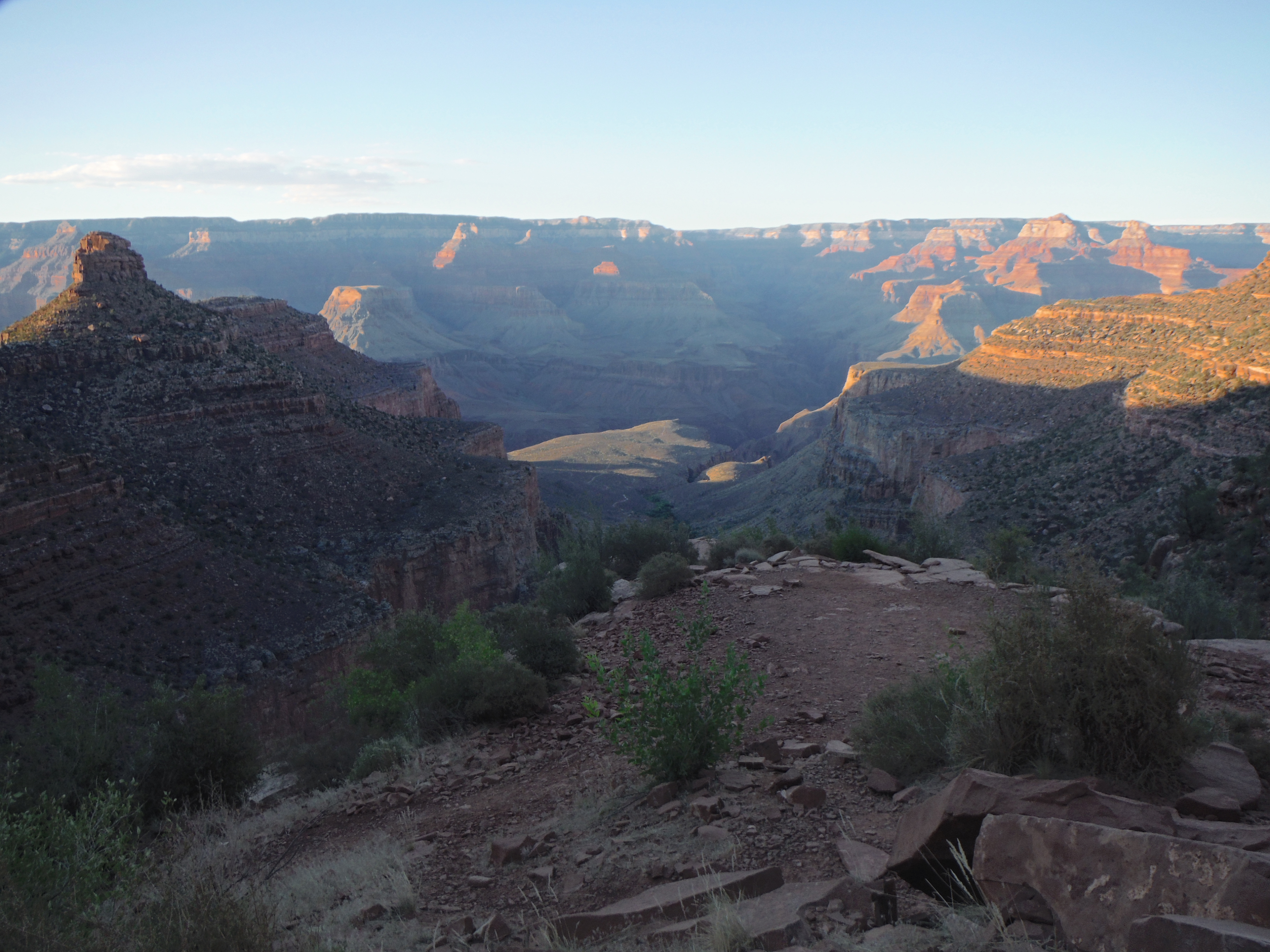 Then, as the sun fell behind the west canyon wall, we began our trip back up. And we began to climb. On the way up, I noticed the elevation change, which is about 3000 feet on way to Indian Gardens, much more. As I began to tire, soon after the first rest stop, I started experiencing vertigo as I looked at the trail but saw the cliff walls to one side or the other in my peripheral vision. At each rest stop I soaked my shirt and bandanna again, and then trudged on again. Since I haven’t hiked at all since last summer, my steps started slowing more and more the higher we got. Eventually we began to stop every two or three hundred feet of vertical climb. I started tracking my progress by how much the sun had set since I had looked behind us as well as how far up we were as compared to the western canyon wall. And finally, climbing the top layer (the white Kaibab), I began to feel the finish. This feeling wore off fairly quickly, only halfway up from the bottom of the layer. From there on, it was pure effort. I didn’t take any more pictures, as the sun had set enough that it wasn’t good lighting. I trudged on, and finally. After having seen the Kolb Studio around a bend and then going through the first, then the second arch, we arrived at the top. Now after coming home and having a good day’s rest, I think I’m ready to go all the way down to the river and back once I have the chance. And after that, I’ll have to attempt going rim to rim (we’ll see if I have enough time off during the summer to do so). I’m also looking forward to doing the hike we did today again, but at a faster clip and stopping to chat with people at the rest stops and Indian Springs.